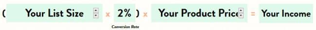 The equation below is fully interactive! Just plug in your list-size goal and the current (or future) price of your product to see how much income you stand to make. Play around with a bigger list size or higher product price to see what’s possible as you grow your email list!