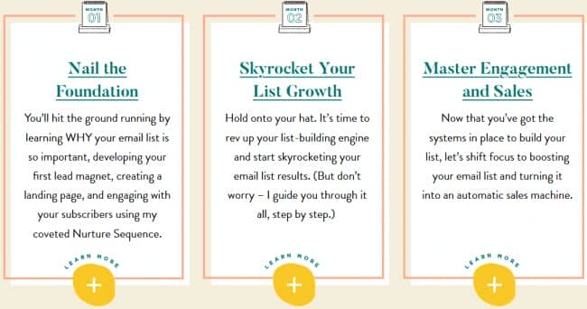 Here’s what I’m teaching you during your 90 days in Email List Academy: